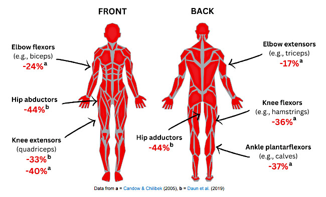 Upper-body muscles, eg. biceps and triceps, lose about 15–25% of their strength with age whilst Lower-body and hip muscles, eg. quadriceps, hamstrings, glutes, and hip stabilisers, lose 35–45% or more. Our lower-body muscles, our muscles of life, lose roughly twice as much strength as many upper-body muscles over time.