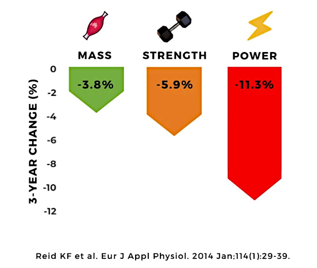 The loss of muscle mass and strength are often observed, but less attention is paid to muscle power, the ability to produce force quickly, such as the ability to move your foot quicky at the loss of balance or walking up stairs.