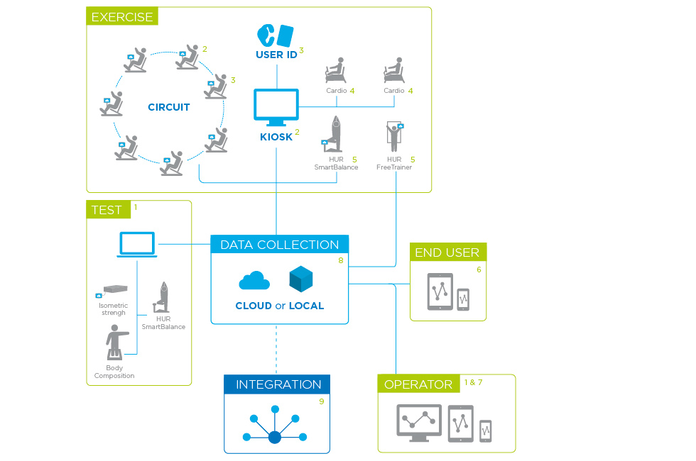 - Your customer starts exercising by logging in at the Kiosk or by going directly to the first HUR SmartTouch exercise device. In HUR circuit, rotation proceeds in a precise order, which results in less queuing for machines.