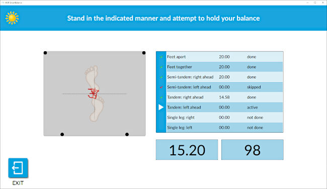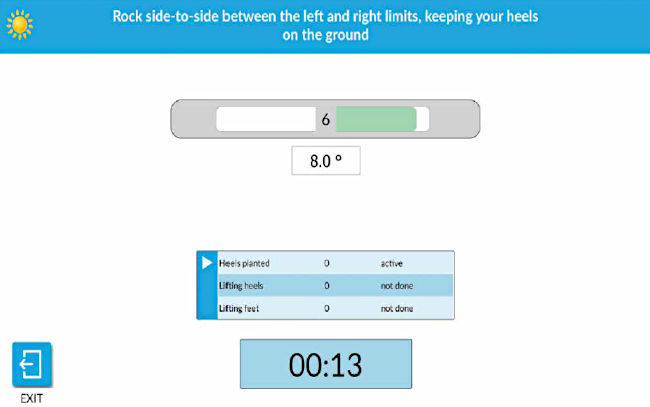 The static balance module trains postural stability and allows for the monitoring of centre of pressure (COP) data in eight different standing positions, progressing in difficulty from standing with feet apart, to single legged standing.