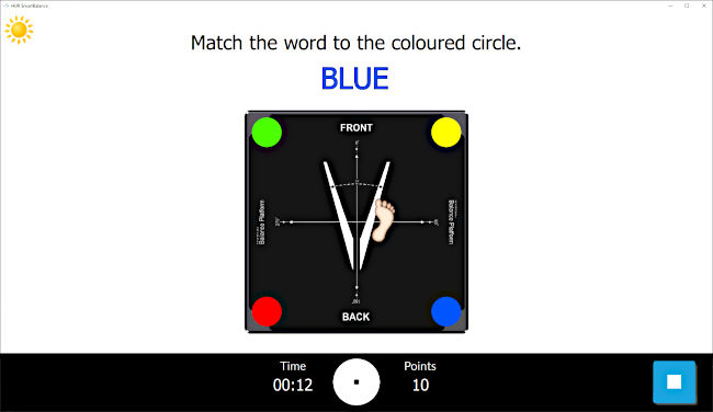 The dynamic balance – stepping mode introduces a cognitive challenge to stepping. In the “colors” game a text states the colour that is to be matched to the colour dot appearing in one of the corners, by stepping on it.