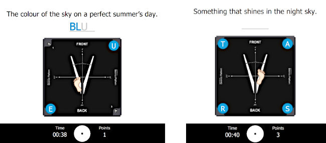 In the first spelling game a clue of a word to be written is given. In the easy version the program gives the trainee clues of the word to be written, a function which is removed in the advanced game. Initially the words are easy four-letter words, advancing to longer words with more stepping functions.