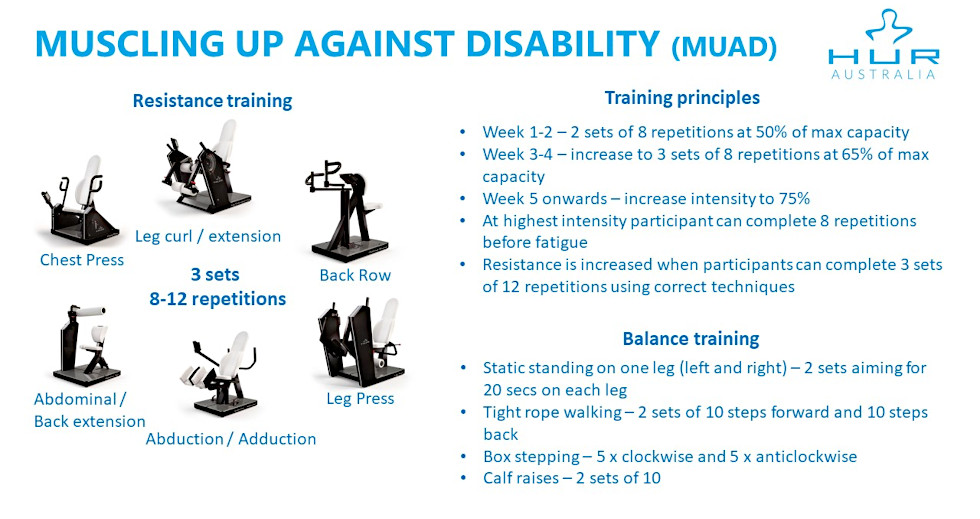 In 2017 a major, Australian government funded, study was completed with the aim of showing that resistance and balance training is an under-utilised approach to tackling later life disability. The Muscling Up Against Disability (MUAD) Project, led by Dr Tim Henwood and supported by HUR equipment, enrolled 240 older adults, ranging in age from 65 to 92,  with a Government supported aged care package, who took part in a twice weekly progressive resistance training program, using HUR equipment, and floor based balance exercises for 24 weeks.