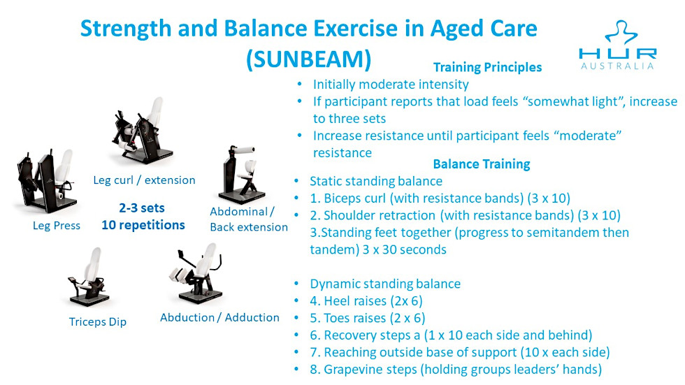 Dr Jennifer Hewitt et al. developed an evidence-based strength and balance program for the prevention and management of physical injuries from falls amongst people in residential aged care in Australia. The SUNBEAM (Strength and Balance in Aged Care) study collected data from 221 residents living in 16 facilities. During the first 6 months, the participants took part in an exercise class led by an allied health professional, twice weekly, consisting of progressive resistance exercise, using HUR equipment, and balance exercises. The initial period was followed by a 6 month, non-machine based weight-bearing and functional exercises. The results provided clear evidence on the benefits of resistance and balance training, demonstrating a 55% reduction in falls. Furthermore, the subjective stories told about the real-life impact: participants were able to get in and out of the car and go out with their family, things which materially improve quality of life.
